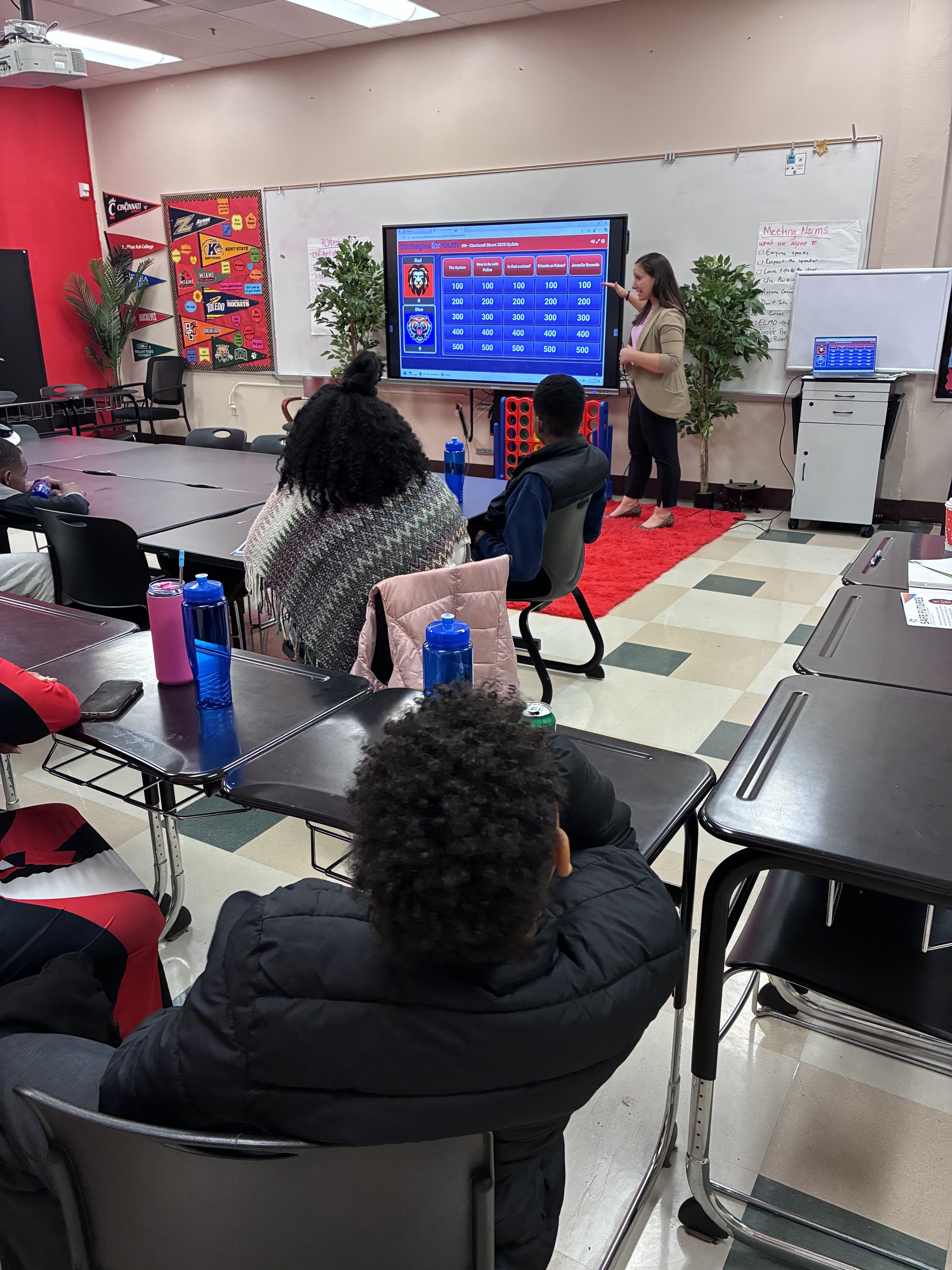 Sarah leading a session of Juvenile Justice Jeopardy at Hughes High School